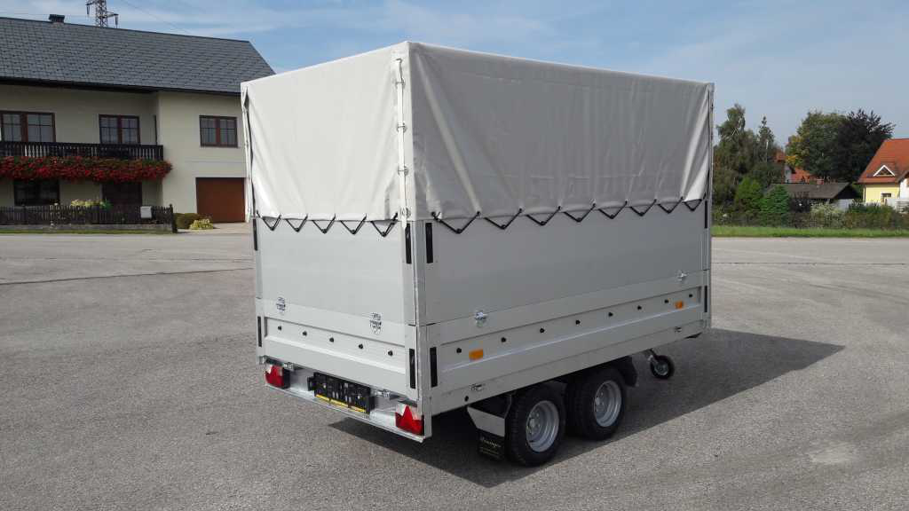 V-Deichsel, Achsen von Knott, 13 oder 14 Zoll Bereifung, Aluwände 350mm eloxiert abklappbar und abnehmbar, Stirnwand fix, Siebdruckboden, verst. Stützrad, Verzurrösen, Auflaufgebremst mit Rückfahrautomatik, Preise auf Anfrage!